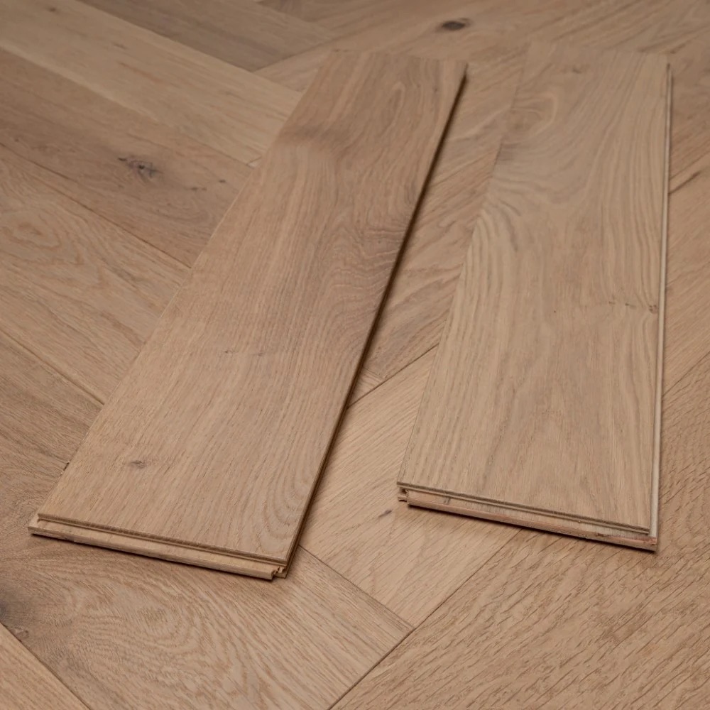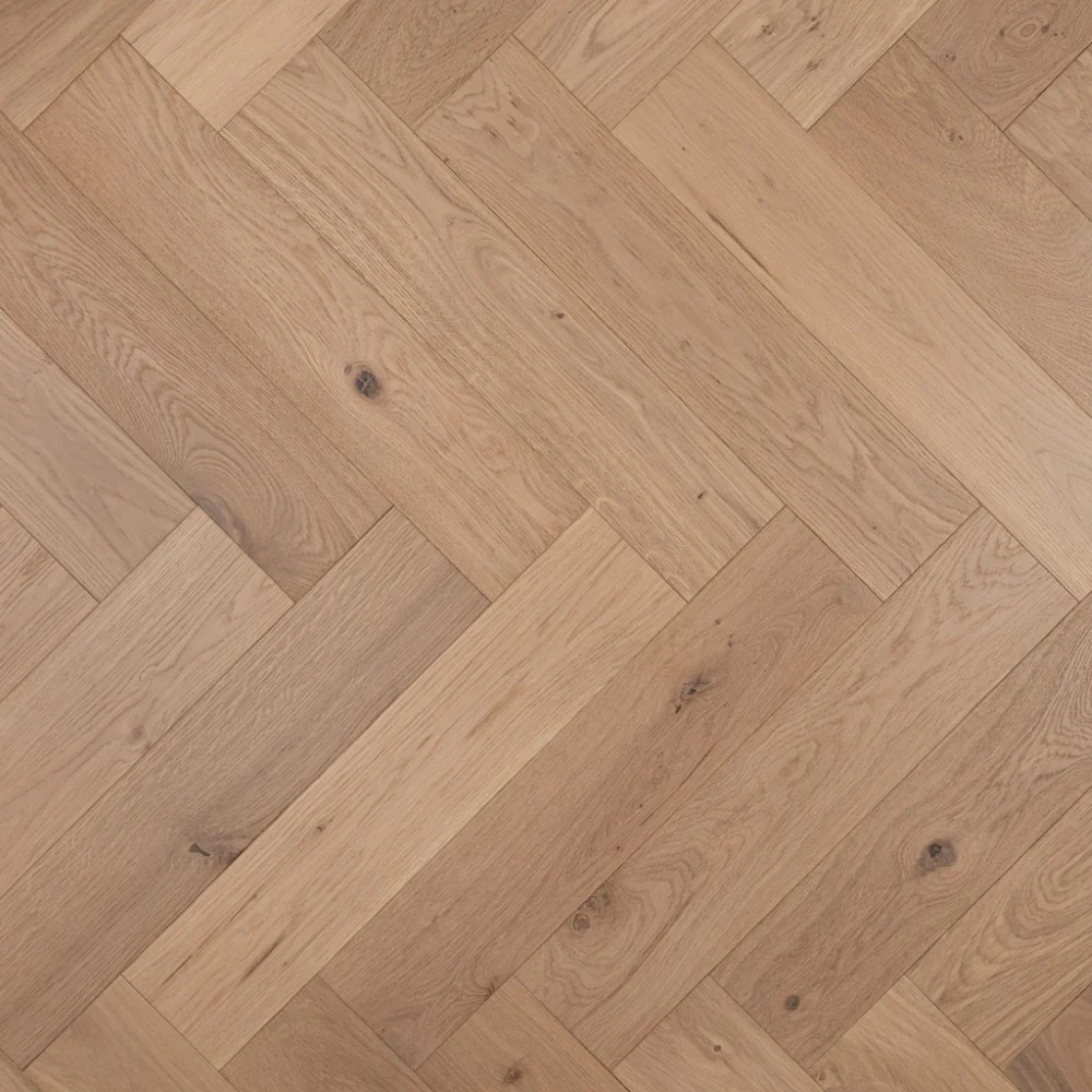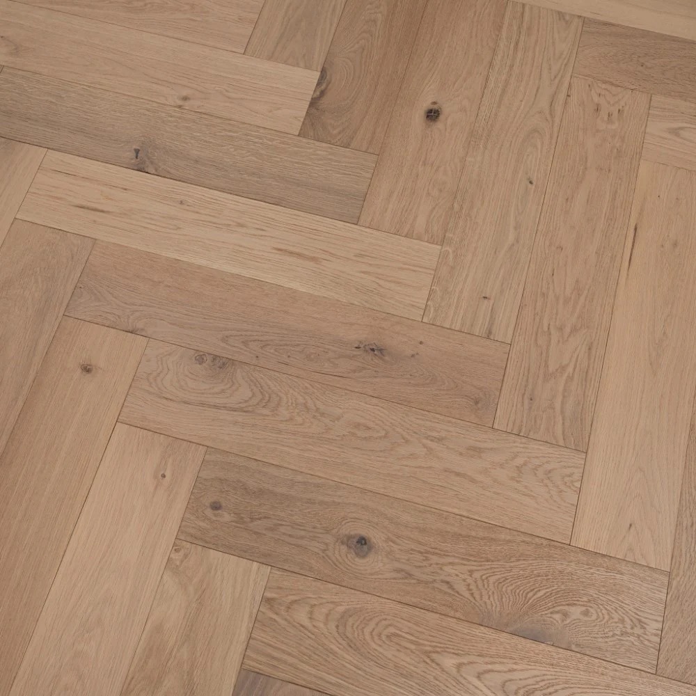 Explore the refined simplicity of our Natural Light Oak Herringbone parquet, featuring an invisible finish lacquer for a seamless appearance. This engineered flooring is both stylish and practical for various settings.