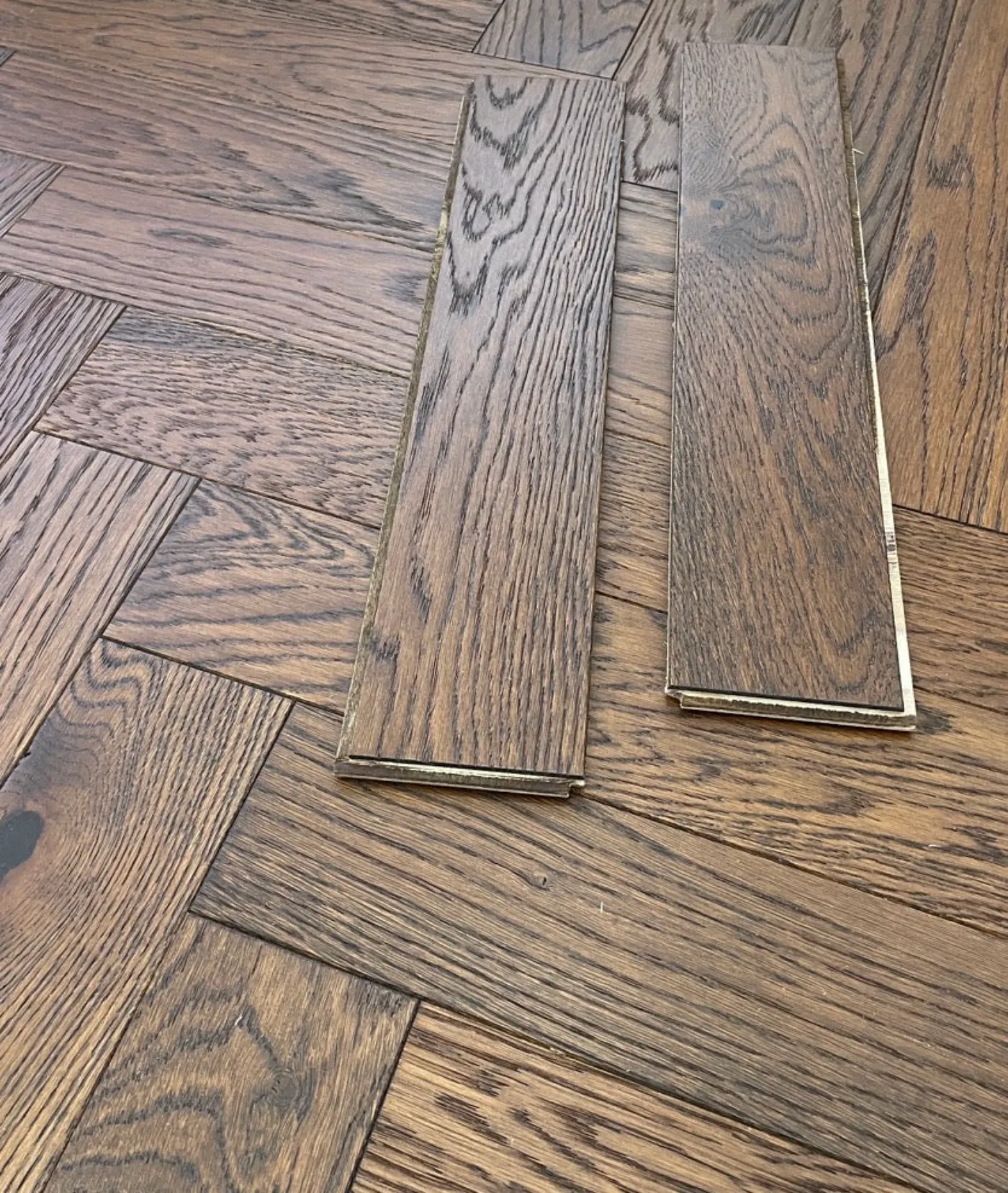 Enhance your living space with the rich and inviting tones of our Smoked Whiskey Oak Herringbone Parquet Flooring. This exquisite flooring option combines the classic appeal of herringbone design with the durability and resilience of engineered oak, perfect for adding warmth and character to any room